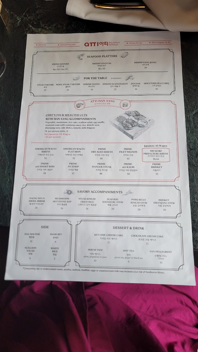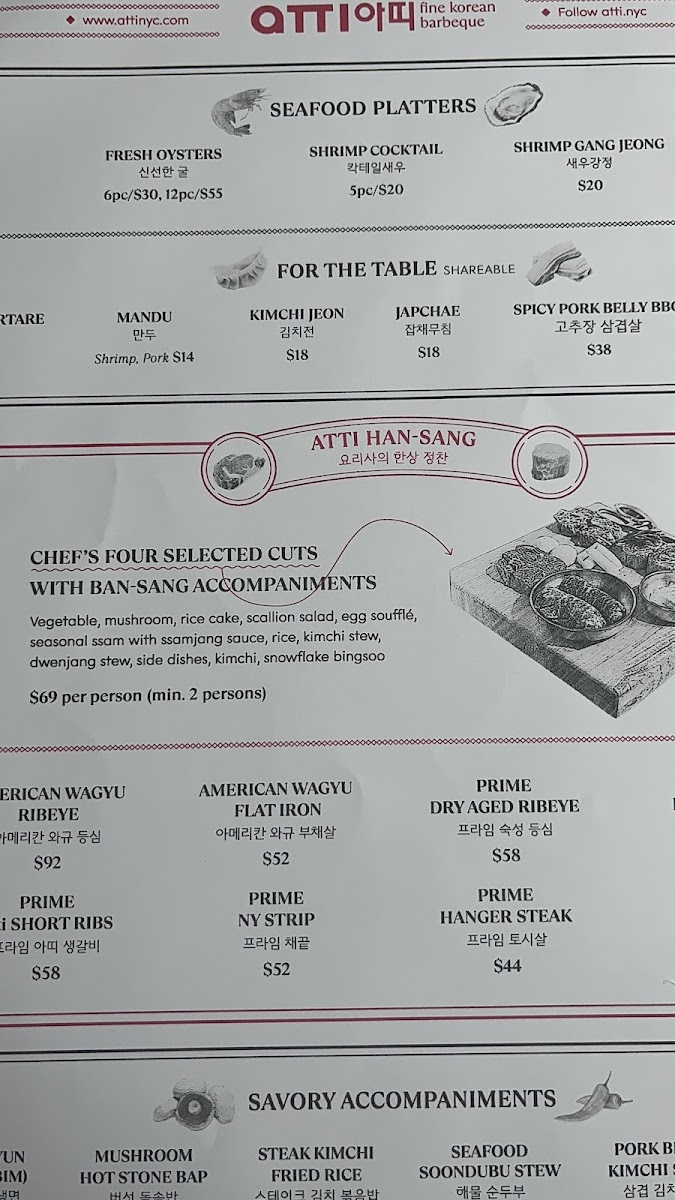 Herbal Boiled Pork Belly comes with Ssam set and Atti special radish kimchi, shrimp sauces, ssamjang, garlic and pepper. Serve with cold radish water kimchi